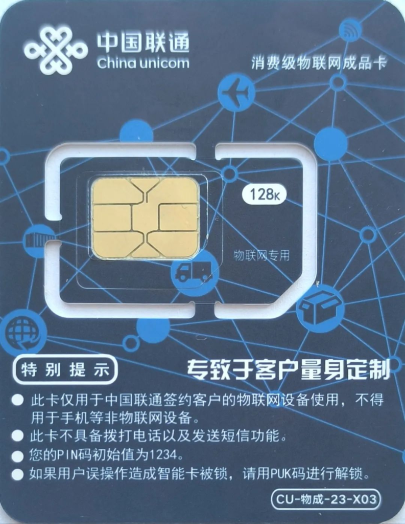 正面特别提示中会印有:此卡仅用于中国联通签约客户的物联网设备使用,不得用于手机等非物联网设备。